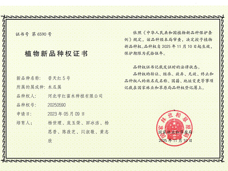 - 河北宇红苗木种植有限公司传来重磅喜讯——旗下普天红系列海棠新品种‘普天红5号’成功斩获国家林草局颁发的植物新品种权证书,为这一享誉业界的海...